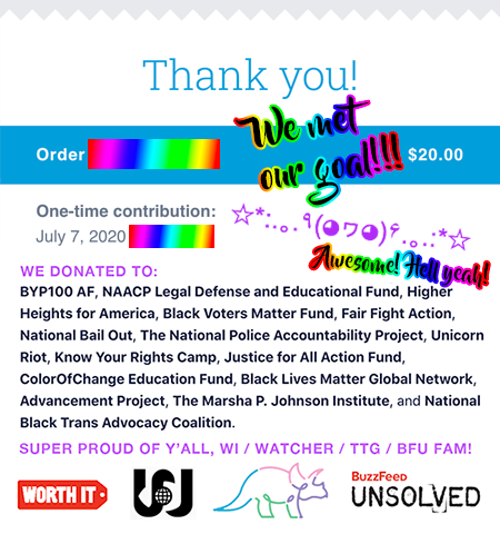 Thank you to everyone who supported! I'm happy to donate on behalf of our community. Really proud of everyone. Please check out these BLM and more human rights resources. I strongly encourage everyone to keep supporting however you can. It's inspiring to see TTG / Watcher / WI / BFU continually speak out and engage in these movements. Once again, thank you for your support. I hope everyone stays safe and well! uwu ♡♡